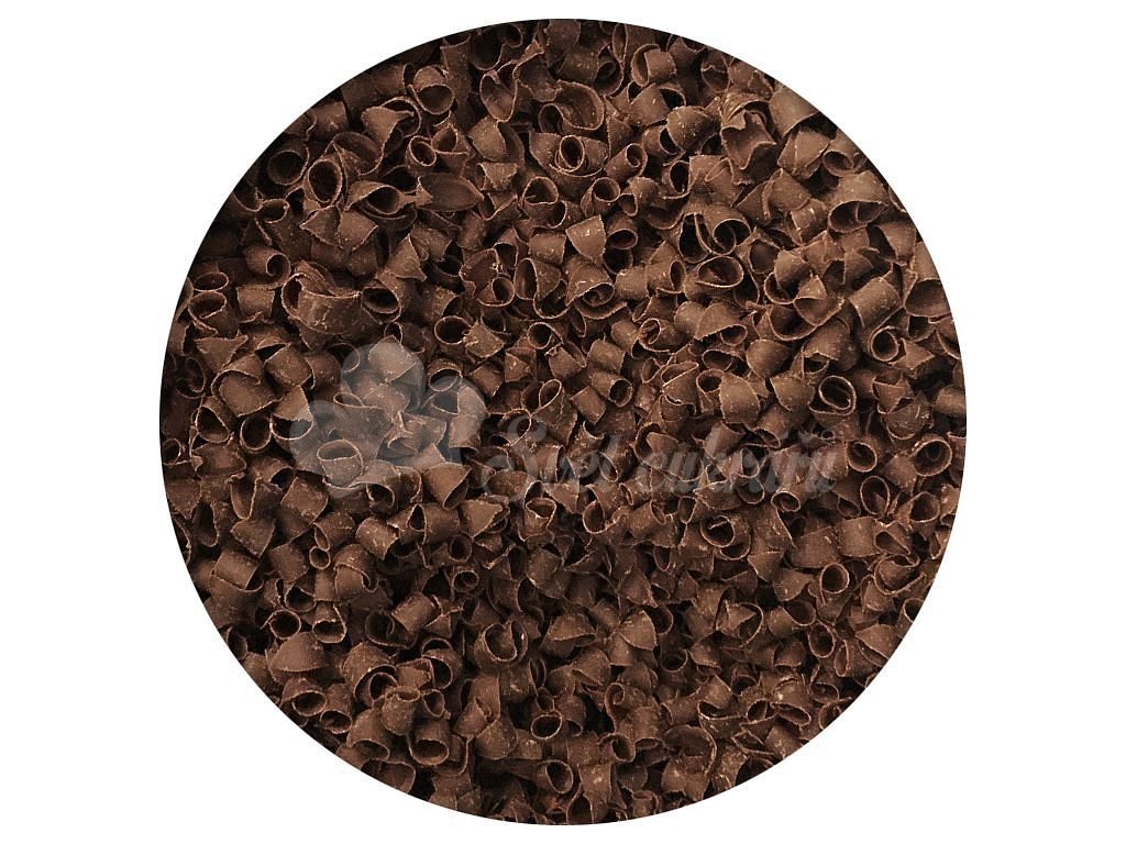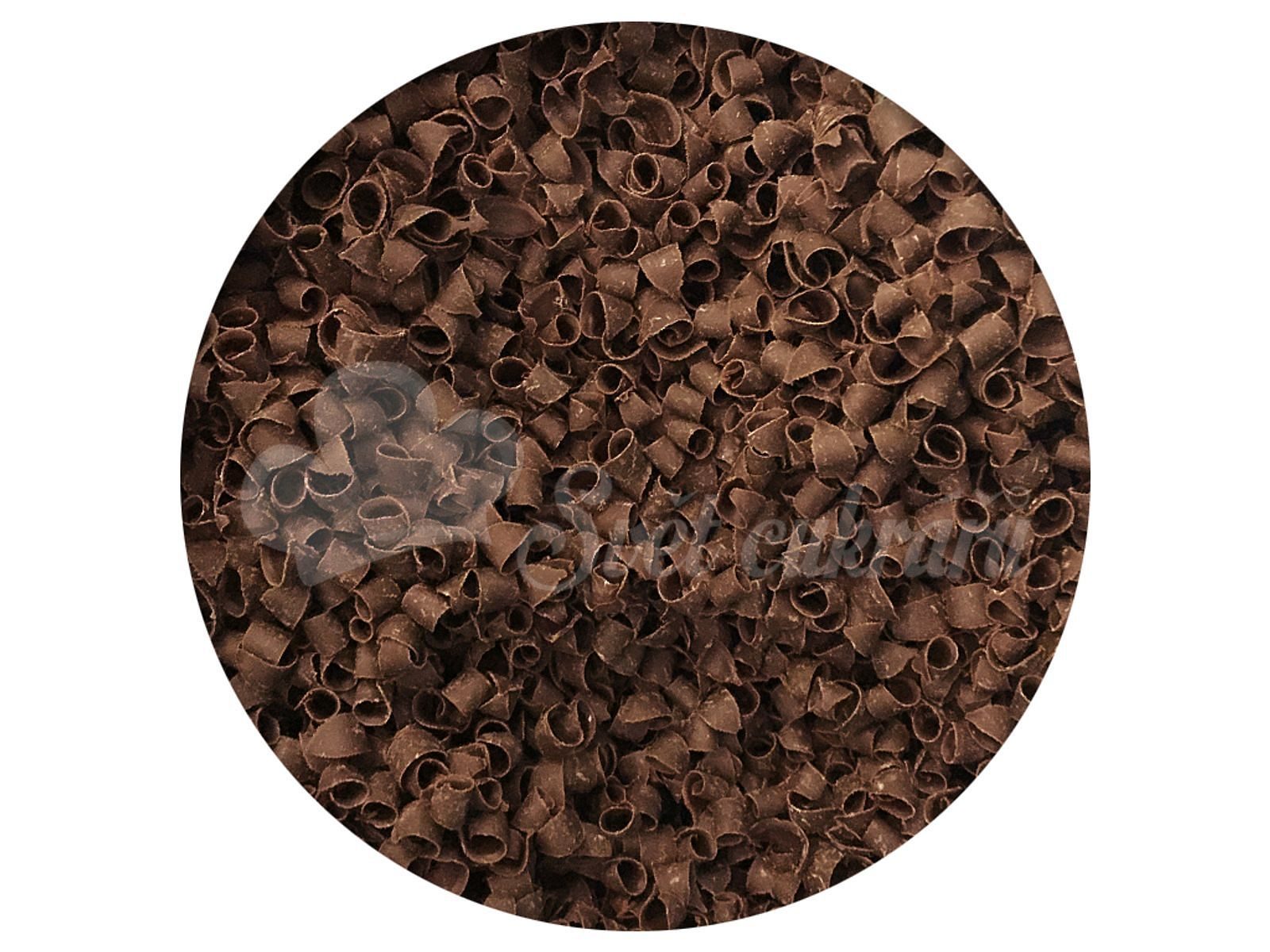 Sötét csokoládé forgács. Cukorkagyártásban felhasználható desszertek, csészék, fagylaltok, kosarak stb.