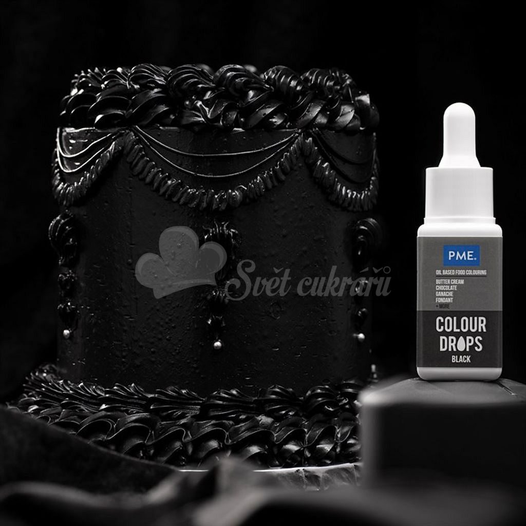 PME Colour Drops Black olajbázisú ételfesték, amellyel könnyedén elérheted a valóban mély, egységes fekete árnyalatot. Zsíros alapokhoz (vajkrém, csokoládé, ganache) különösen ideális, cseppentővel pontosan adagolható.