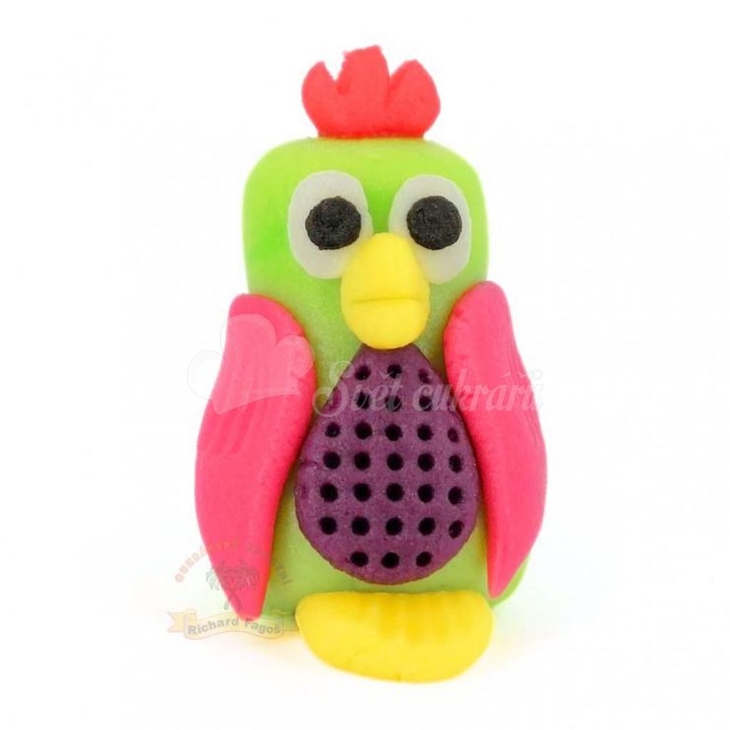 Alkalmi papagáj cukorfigura kézzel készítve, kókuszos modellező masszából, édes mandula aromával. Vidám, színes tortadísz születésnapra, bulira vagy esküvői desszertekre.