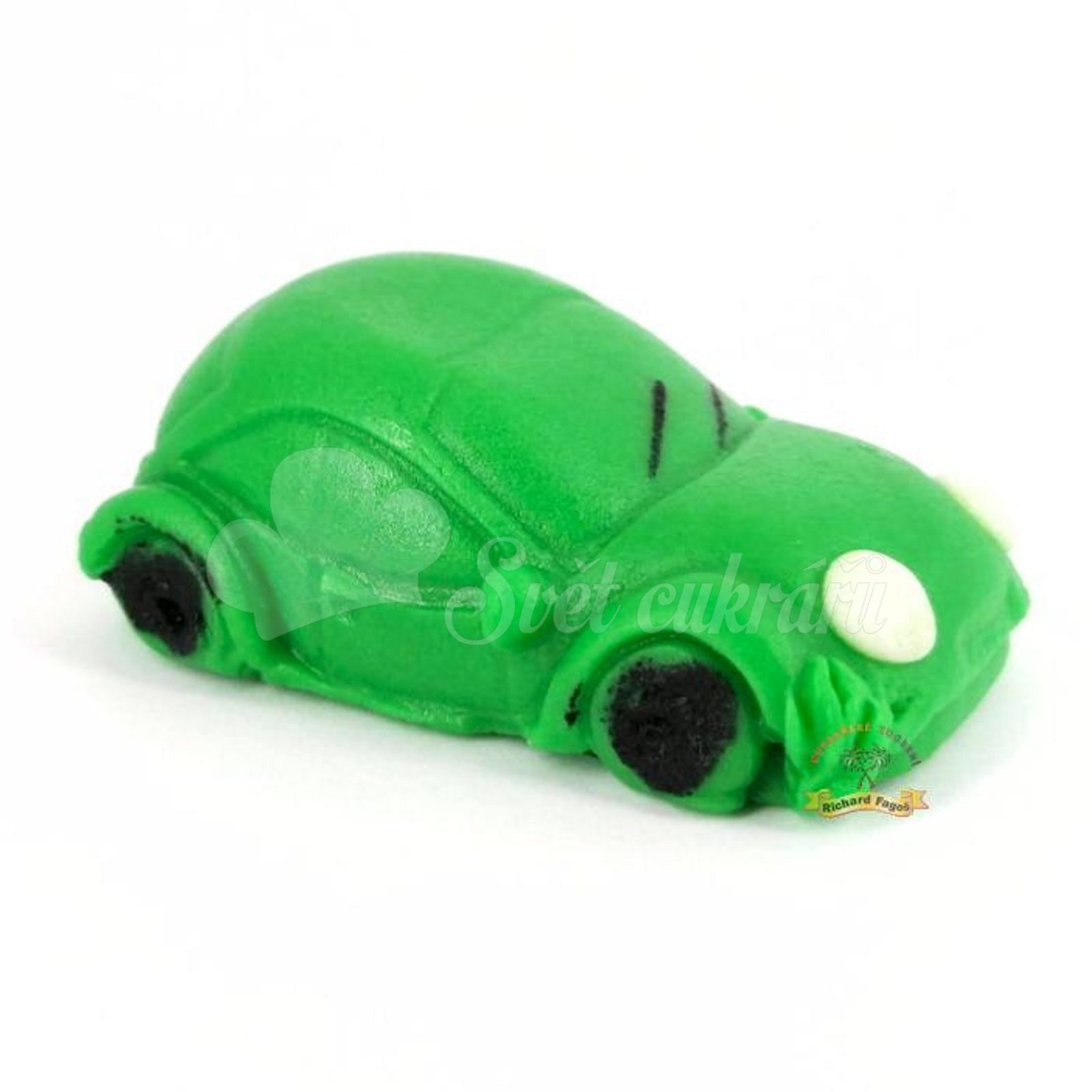 Ehető, kézzel készült zöld autó figura kókuszos modellező masszából, édes mandula aromával. Vidám, látványos dísz gyerektortákra és süteményekre.