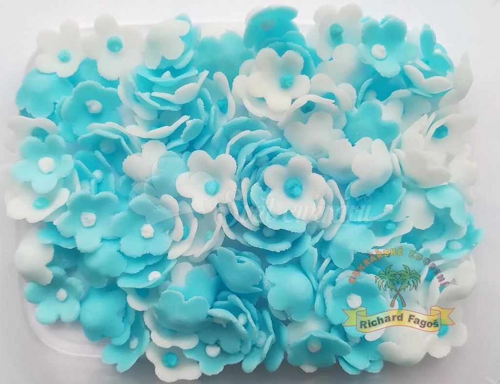 Modellezett, kézzel készített kék cukorvirágok torták és desszertek díszítéséhez. 20 g-os csomag, kb. 180 db apró (kb. 1 cm) virág.