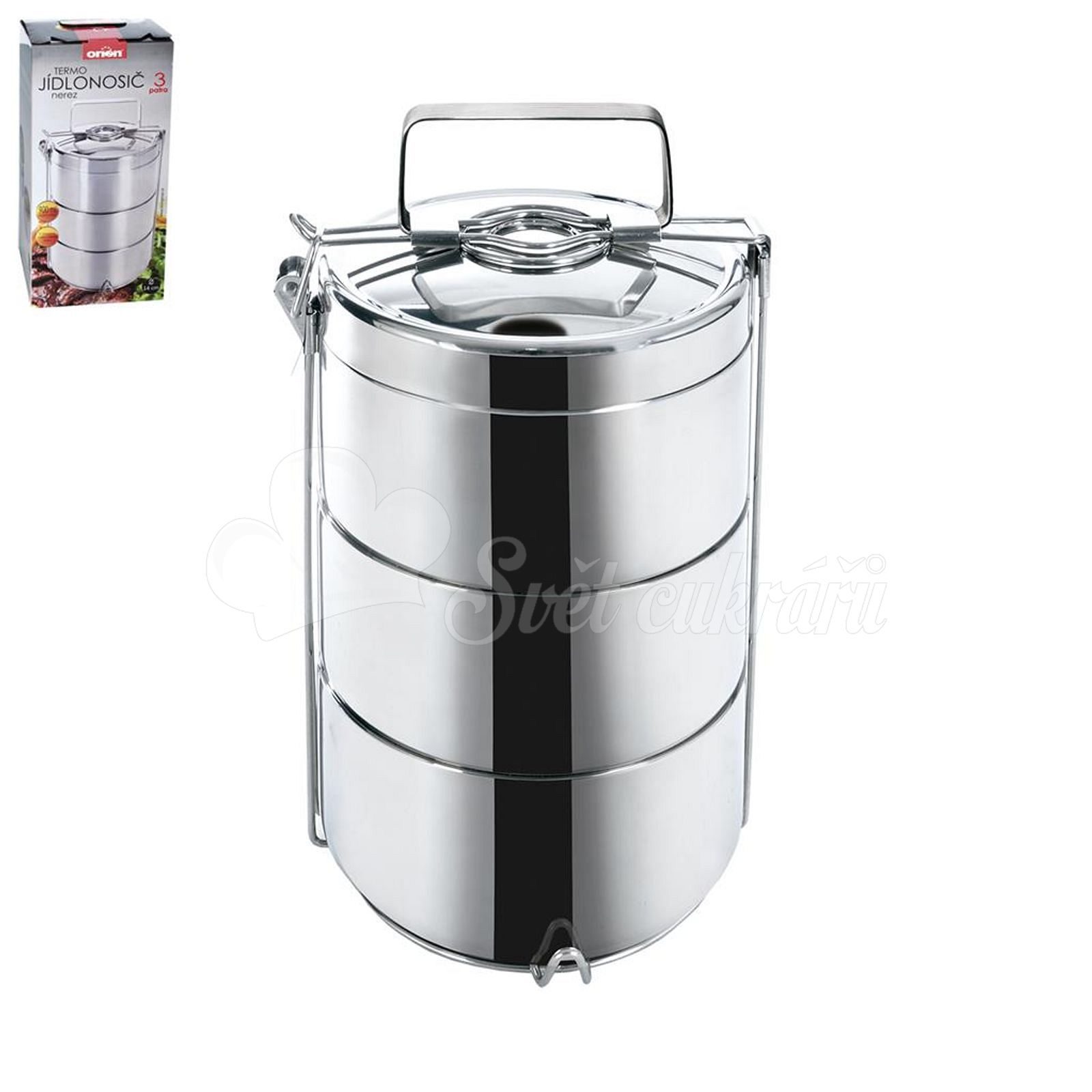 Az élelmiszerek szállításához használt hőhordozó hosszú ideig fenntartja a hőmérsékletet. Tartalmaz egy csattal felszerelt fémállványt, amely biztosítja a szoros lezárását és a felső fedelet. Anyag: rozsdamentes acél. 3 emelet. Méretek: térfogat 3x 0,9 l, átmérő 14 cm, teljes magasság 29 cm.