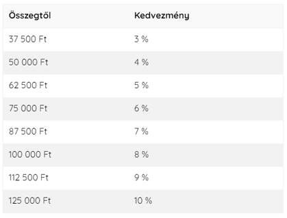 Egyszeri kedvezményt nem kap, de ha követi Facebookunkat vagy feliratkozik a hírlevélre, rendszeresen publikálunk kedvezménykódokat ezen a csatornán keresztül. Ha azonban feliratkozik egy e-üzletre, és regisztrált végfelhasználóként vásárol, minden egyes vásárláskor automatikusan kedvezményt kap minden további vásárlásért. Ezek akár 10% -ot is eredményezhetnek. Ahhoz, hogy ezt a 10% árengedményt kapja, elegendő zaregisztrálni és minden vásárlás előtt jelentkezzen be ugyanazzal az e-mail címmel. Ezután kedvezményeket kap a kiadásainak megfelelően, az alábbi táblázat szerint: