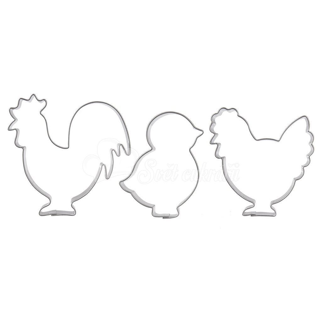 Vidám, tavaszi hangulatú kiszúrókészlet 3 formával: kakas, tyúk és csibe. Ideális kekszekhez, mézeskalácshoz és marcipán díszekhez.