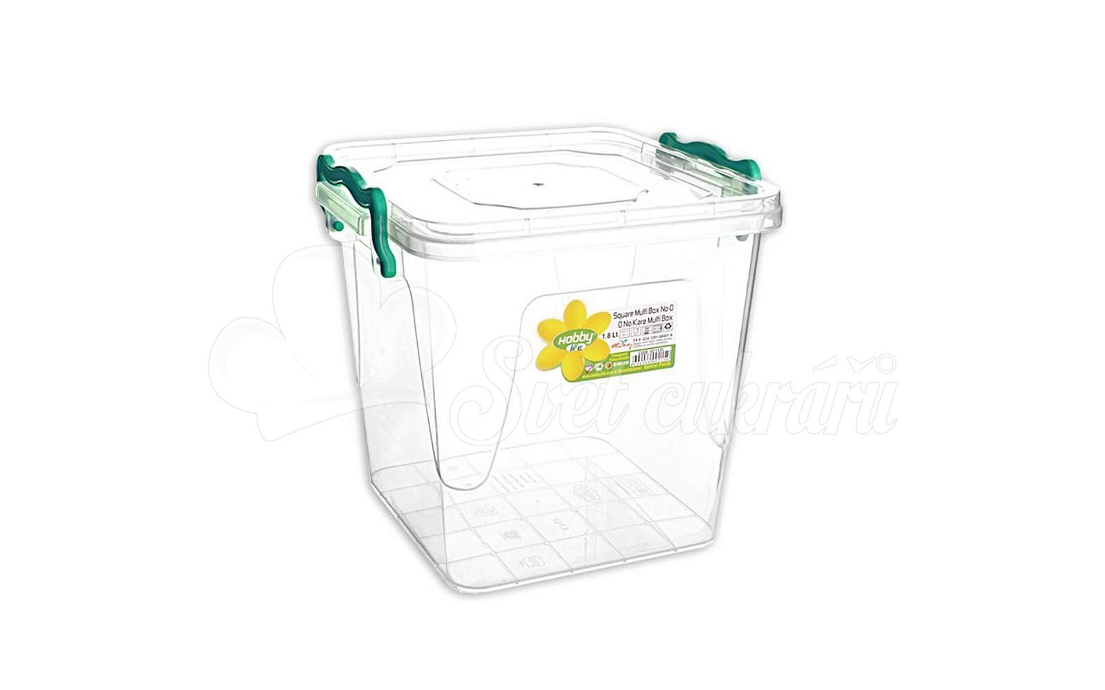 A gyakorlati műanyag dobozokat széles körben használják. A doboz műanyag kapcsokkal rendelkezik a szoros lezáráshoz. Az előnye az összecsukható négyzet alakú forma.