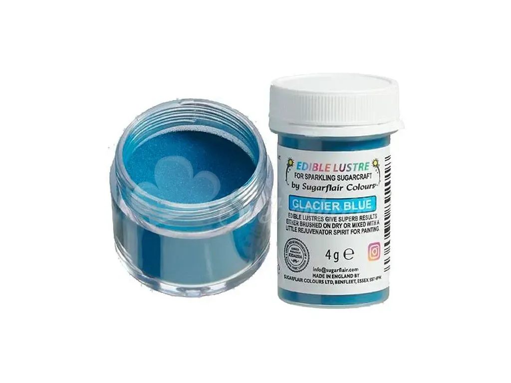 A jeges kék gyöngyfesték színű porja a bevonó és modellező anyagok, a marcipán és a csokoládé fényes csillogó hatására.